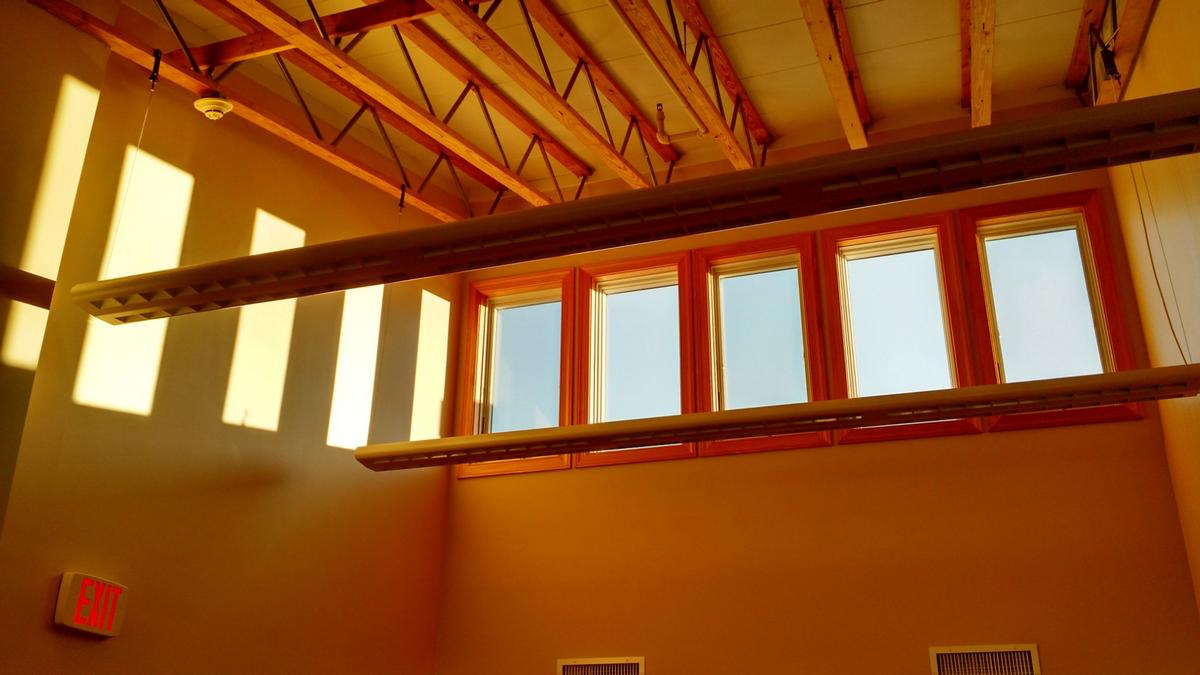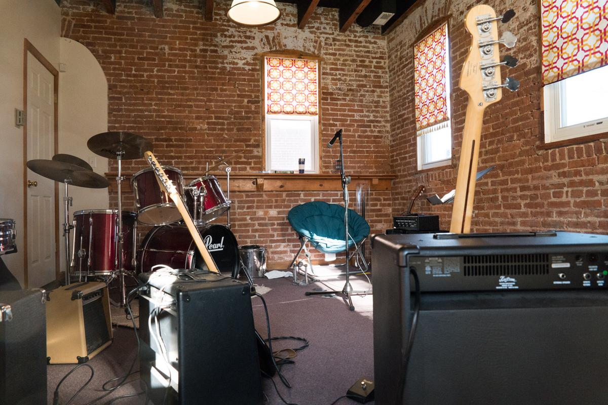 Our carriage house contains music equipment and a workshop for the school's noisier activities. Most of our musical instruments, including guitars, a drum set, and piano, are housed in the neighboring carriage house, another building on the property that is about 900 square feet. We also have a recording room upstairs in the carriage house that has sound-dampening materials for recording vocals and instruments, as well as for producing computer music. The carriage house also houses a workshop with woodworking equipment, materials, and tools.